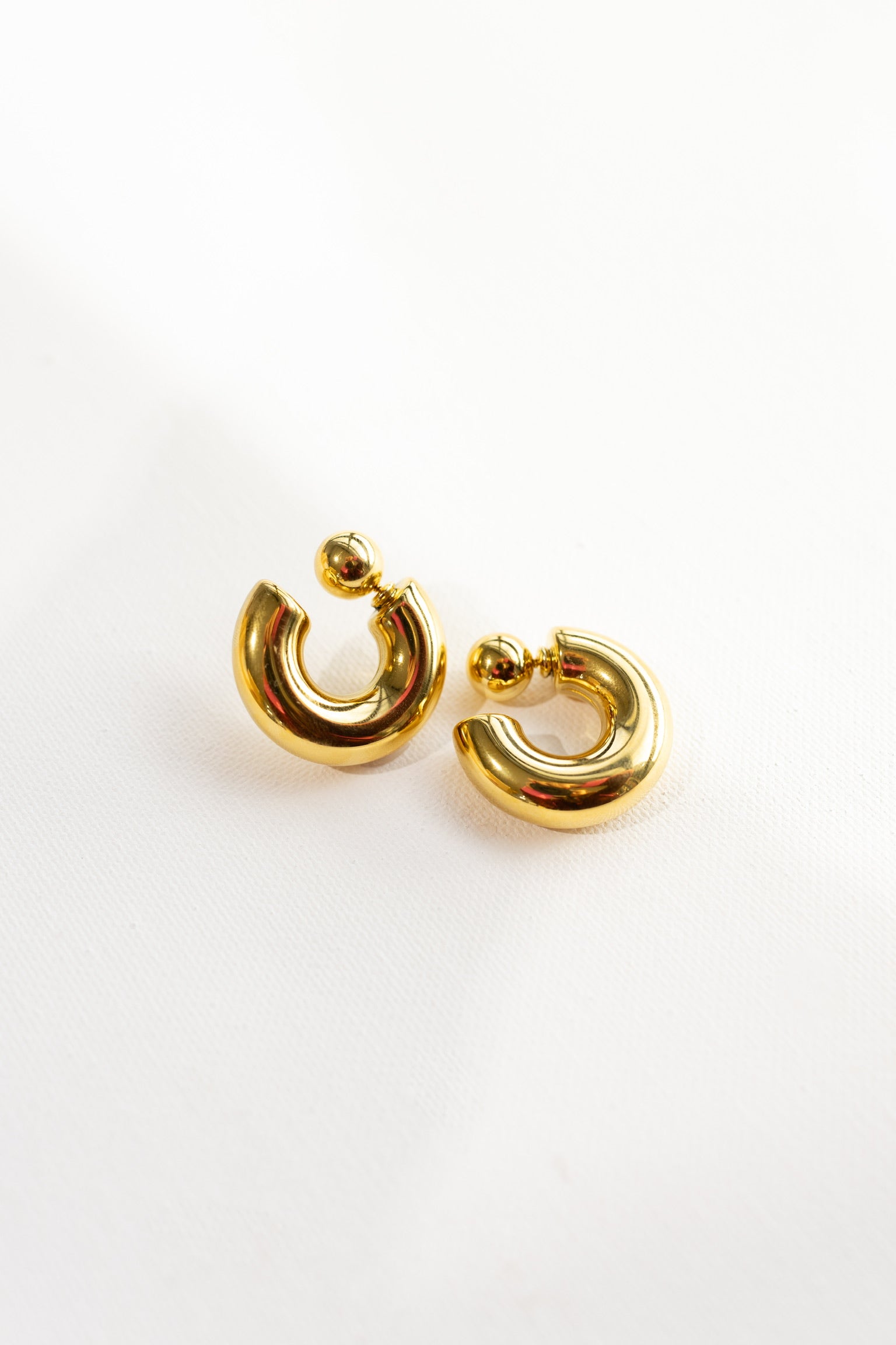Make a bold fashion statement with our Everson Gold Reverse Hoop Earrings! These chunky gold hoops can be worn two ways - as traditional hoops or reversed for a unique twist. Plus, they're waterproof for all-day wear. Upgrade your earring game with these versatile and stylish hoops.